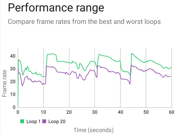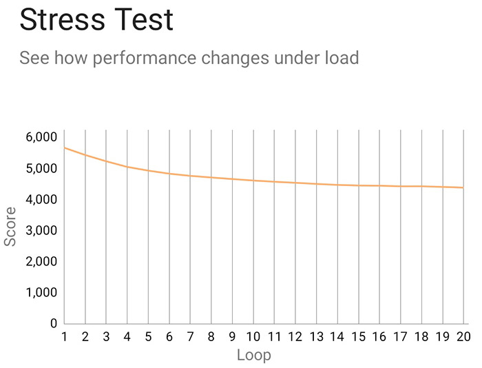 20번의 반복 테스트 결과 최대 점수는 5,678, 최저 스코어는 4,392로 나왔다. 점수 그래프를 볼 때 성능이 급격히 낮아지는 것이 아니라 단계적으로 서서히 떨어지는 것을 확인할 수 있다. 발열로 인해 성능을 제한하는 스로틀링이 급격하게 일어나지 않지만, 고성능 모드에서 장시간 테스트를 끝냈을 때 뜨겁다고 느껴질 정도의 열이 있었다. 첫 테스트에서 최대 41 프레임까지 나왔으나 마지막 테스트에서 최대 30 프레임 대로 떨어졌다.