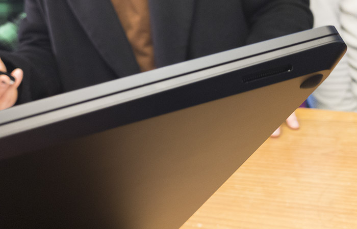 새로운 서피스 랩탑 3의 가장 변화는 종전 13인치 화면과 더불어 15인치 대형 디스플레이를 탑재한 점이다. 이 자리에서 13인치와 15인치 서피스 랩탑 3를 봤을 때 확실히 큰 디스플레이에서 느끼는 시원함은 말로 표현하기 힘들다. 화면을 둘러싼 베젤은 비교적 얇긴 하나 그래도 띠를 두른 느낌을 완전히 벗지는 못했다. 베젤 상단에 카메라와 고성능 스튜디오 마이크를 들어 있는 구조는 크게 달라지지 않았다.