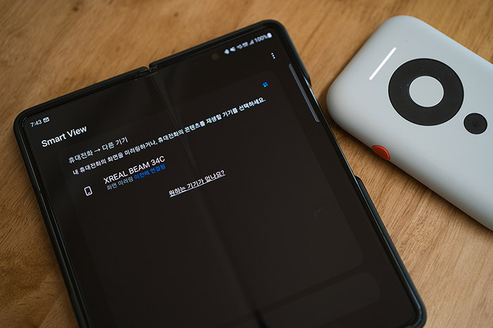 무선 미러링은 선 하나를 덜 연결하는 장점은 있다. 하지만, 상대적으로 단점이 좀더 크다. 무선 미러링을 하려면 스마트 장치 또는 PC의 설정에서 엑스리얼 빔을 찾아 연결하는 과정을 거쳐야 한다. 갤럭시의 스마트 뷰나 아이폰의 에어 플레이 버튼을 누른 뒤 엑스리얼 빔을 찾는 게 어렵진 않다. 하지만 한두 번이면 몰라도 매번 설정을 들락날락하며 이 과정을 반복해야 하는 것은 은근 불편할 수밖에 없다.